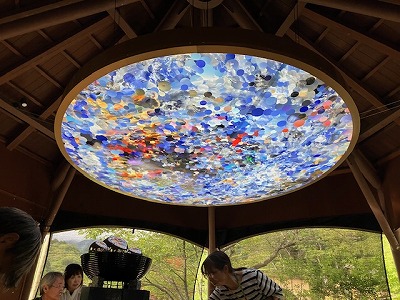 足湯の天井には鮮やかなオブジェ 空を映した写真を集めたものです