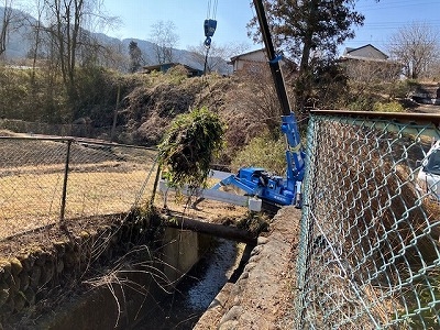 太く育って枯れた『イタドリ』などを クレーンで吊り上げて